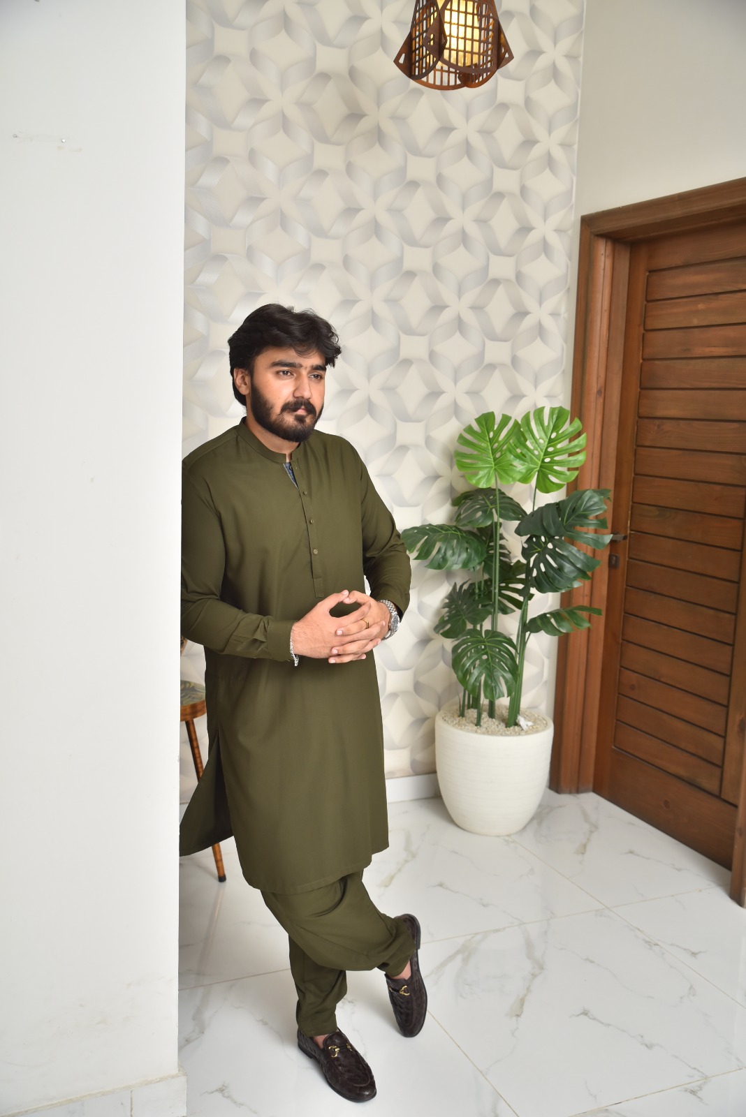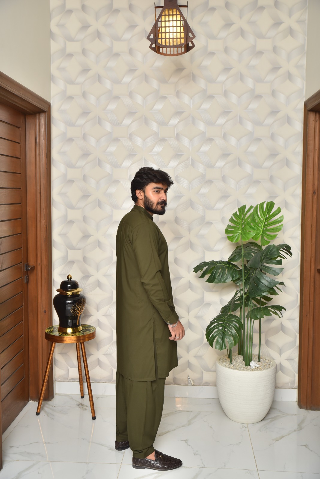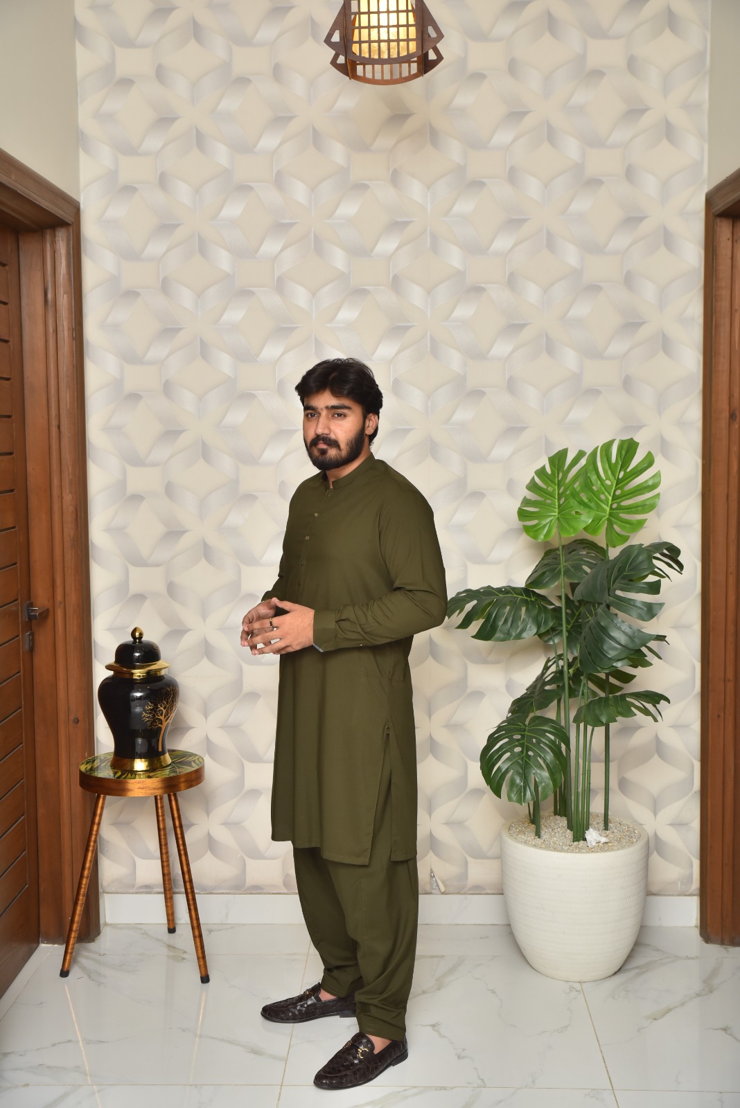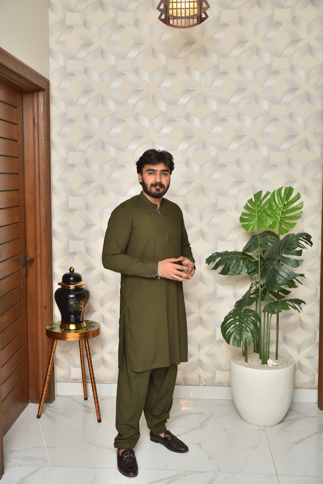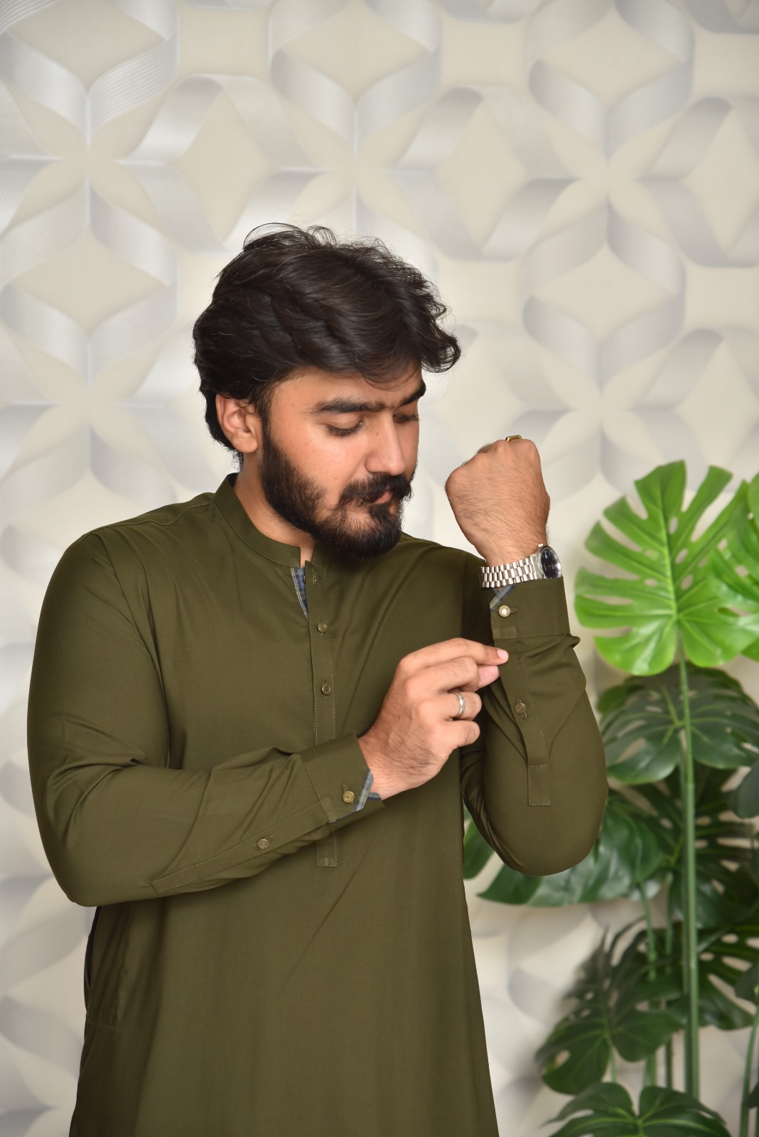 This men shalwar kameez is a go-to piece for anyone looking for a sharp. Put together look that doesn’t compromise on comfort. The deep Mehndi shade is both sophisticate and versatile, easily matching with different waistcoats or jackets.