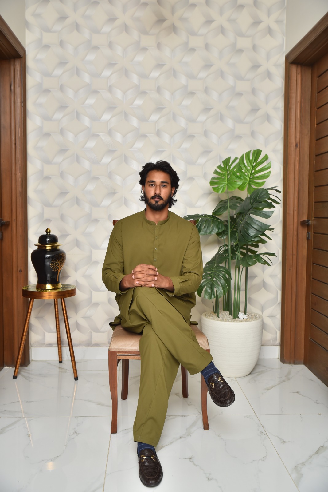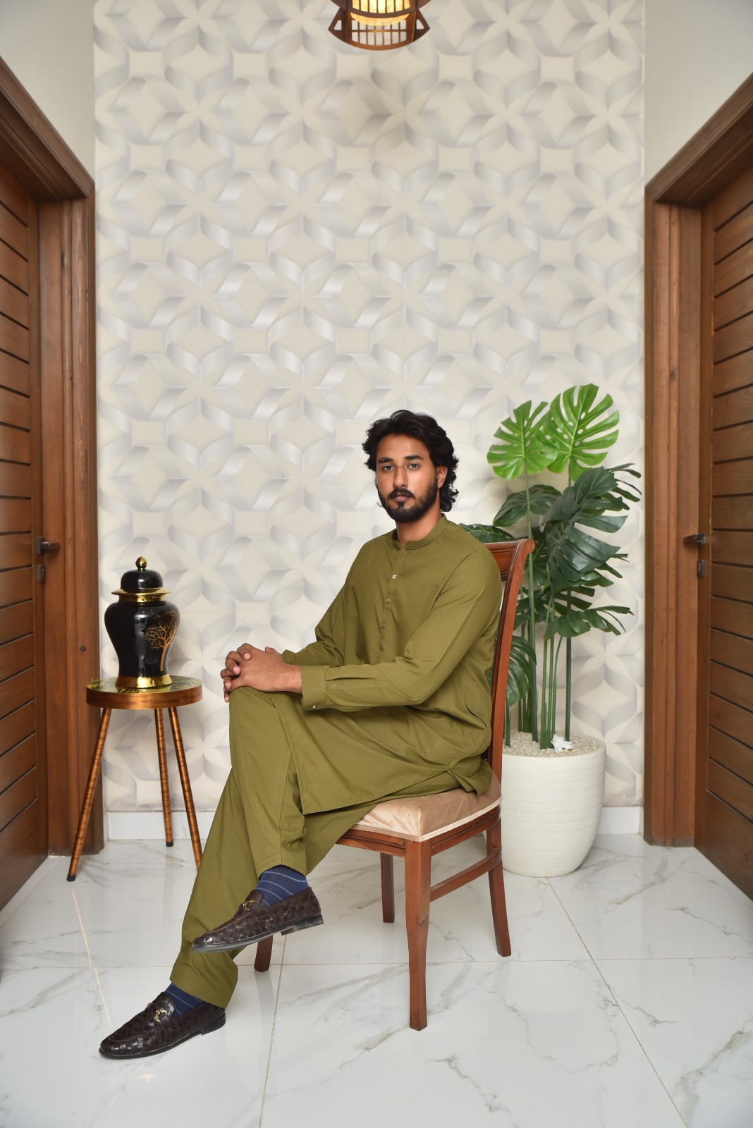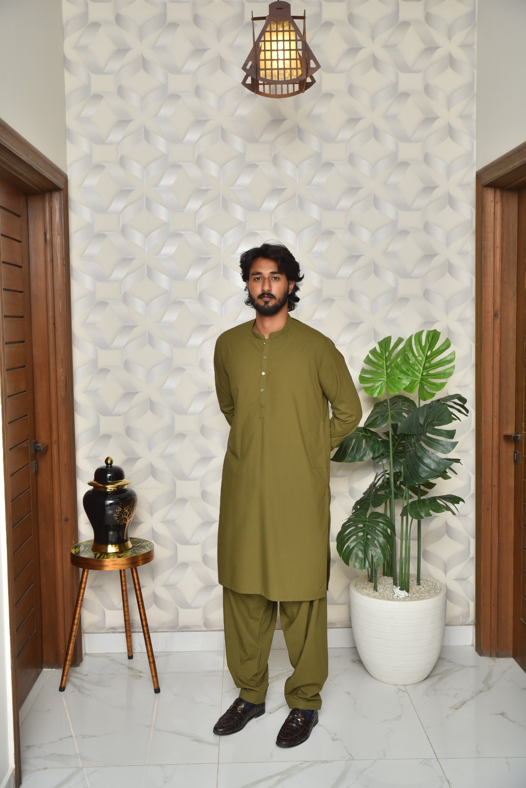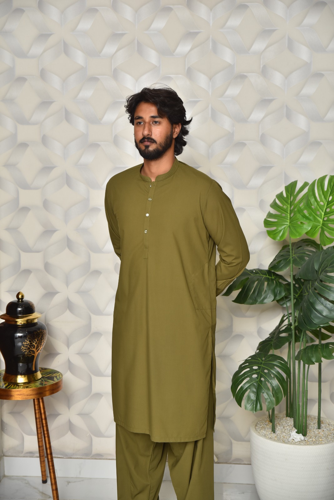 In terms of design, this is a truly stylish shalwar kameez design man. The kurta features a modern, straight cut with a stylish collar and three-button placket. The embroidery is strategically placed along the neckline and cuffs, adding a touch of luxury without being overwhelming. It’s a balanced look that is elegant and masculine. This is exactly the kind of stylish gents shalwar kameez that stands out for its refined aesthetic.